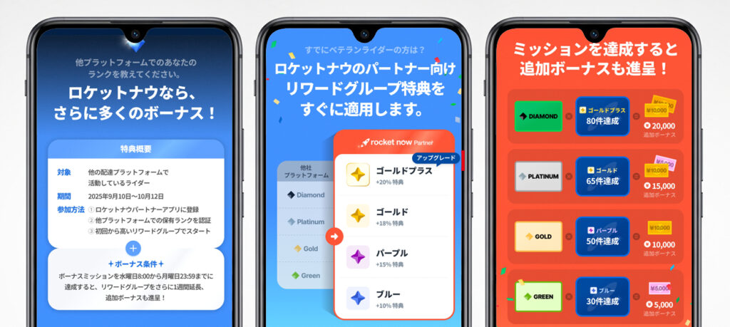 他社プラットフォームの保有ランクを認証することで、ロケットナウの配達パートナー登録時から高いリワードで配達を始めることができる「乗り換え、ロケットナウへ」キャンペーンが実施されています。