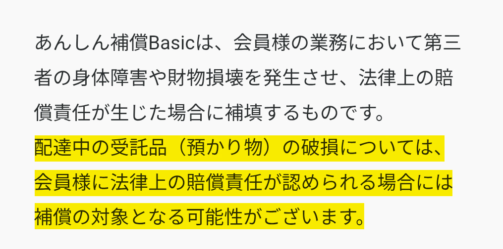 その返答として「配達中の受託品(預かり物)の破損について、会員に法律上の賠償責任が認められる場合には補償の対象となる可能性がある」との回答がありました。