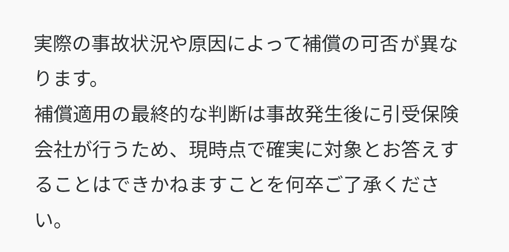 実際の事故内容によっては保険会社の状況確認を経て、補償範囲が異なる可能性があります。