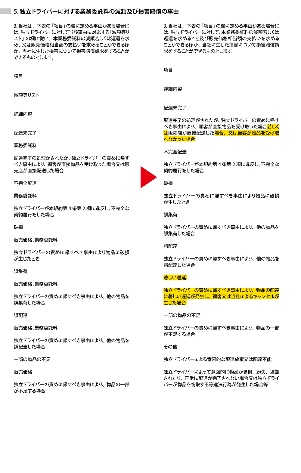 減額対象・損害賠償の拡大: 商品の破損や誤配達、さらには「著しい遅延」や「意図的な配達放棄」についても、報酬の減額だけでなく商品代金(販売価格相当額)の請求ができる旨が明記されました。