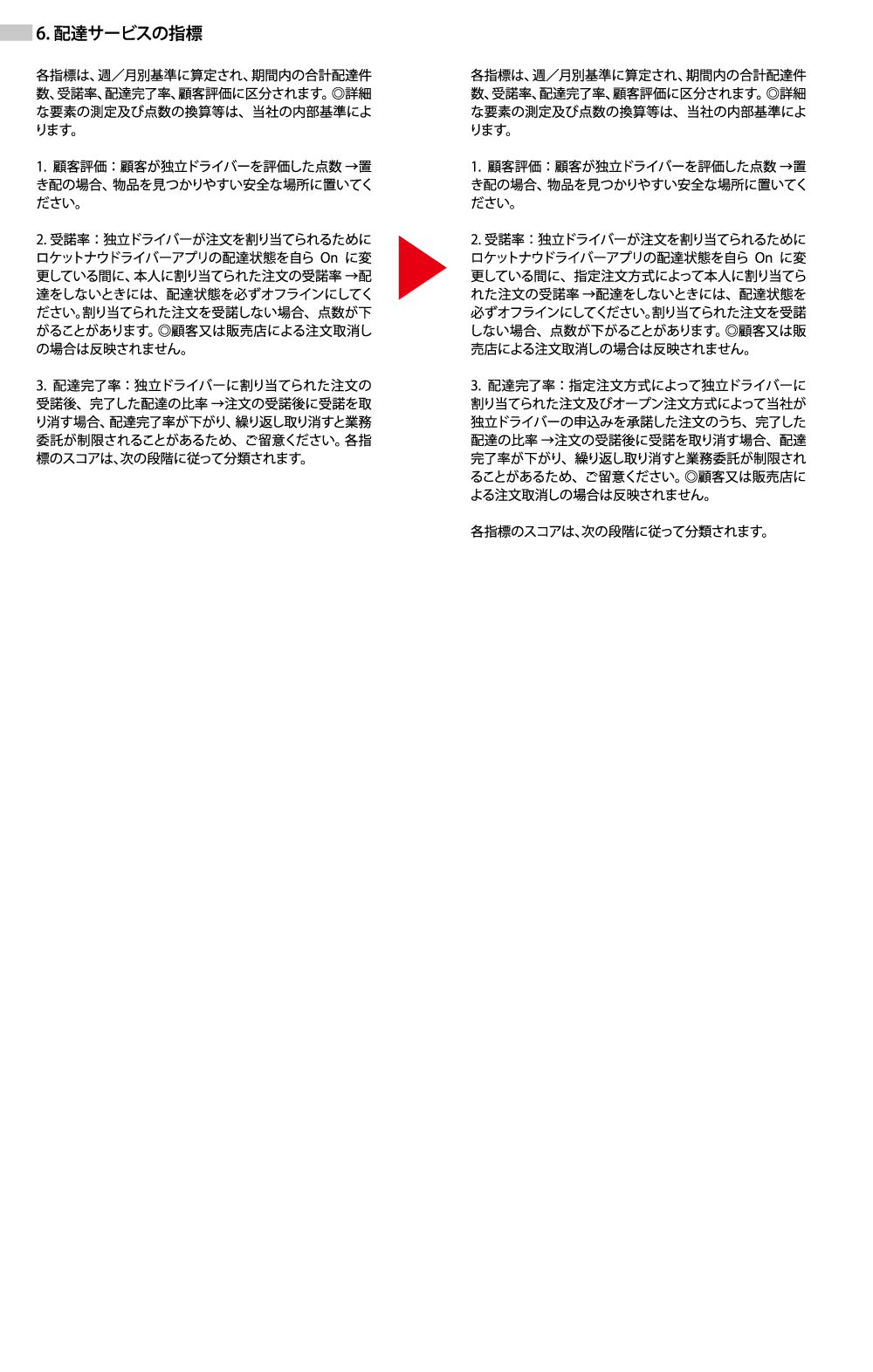評価指標(受諾率・完了率)の定義変更: 注文方式が増えたことに伴い、計算方法が整理されました。早押し(マルチキャスト方式)の場合、応募後のキャンセルは配達完了率低下につながります。